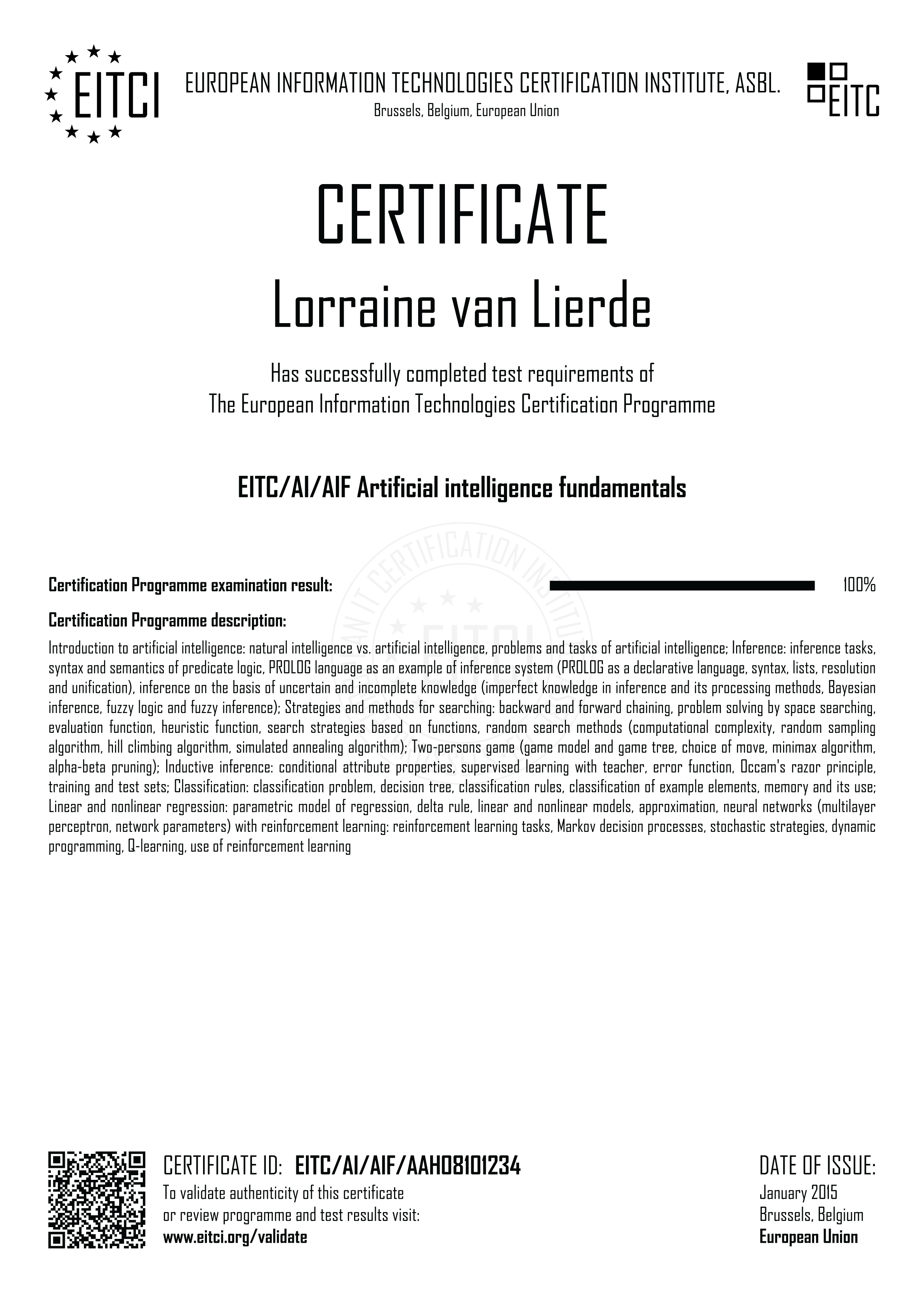By enroling for the European Information Technologies Certification EITC/AI/AIF Artificial intelligence fundamentals you will have access to the complete didactic programme corresponding to the Certification Curriculum and the relevant examination procedure implemented fully remotely (with free additional retakes if required). Upon successful passing of the EITC/AI/AIF examination a verifiable personalized EITC Certification will be issued in your name from Brussels under governance of the European Information Technologies Certification Institute EITCI, the accreditation and certification body for the programme. For all the details on the certification procedure please refer to How It Works section.