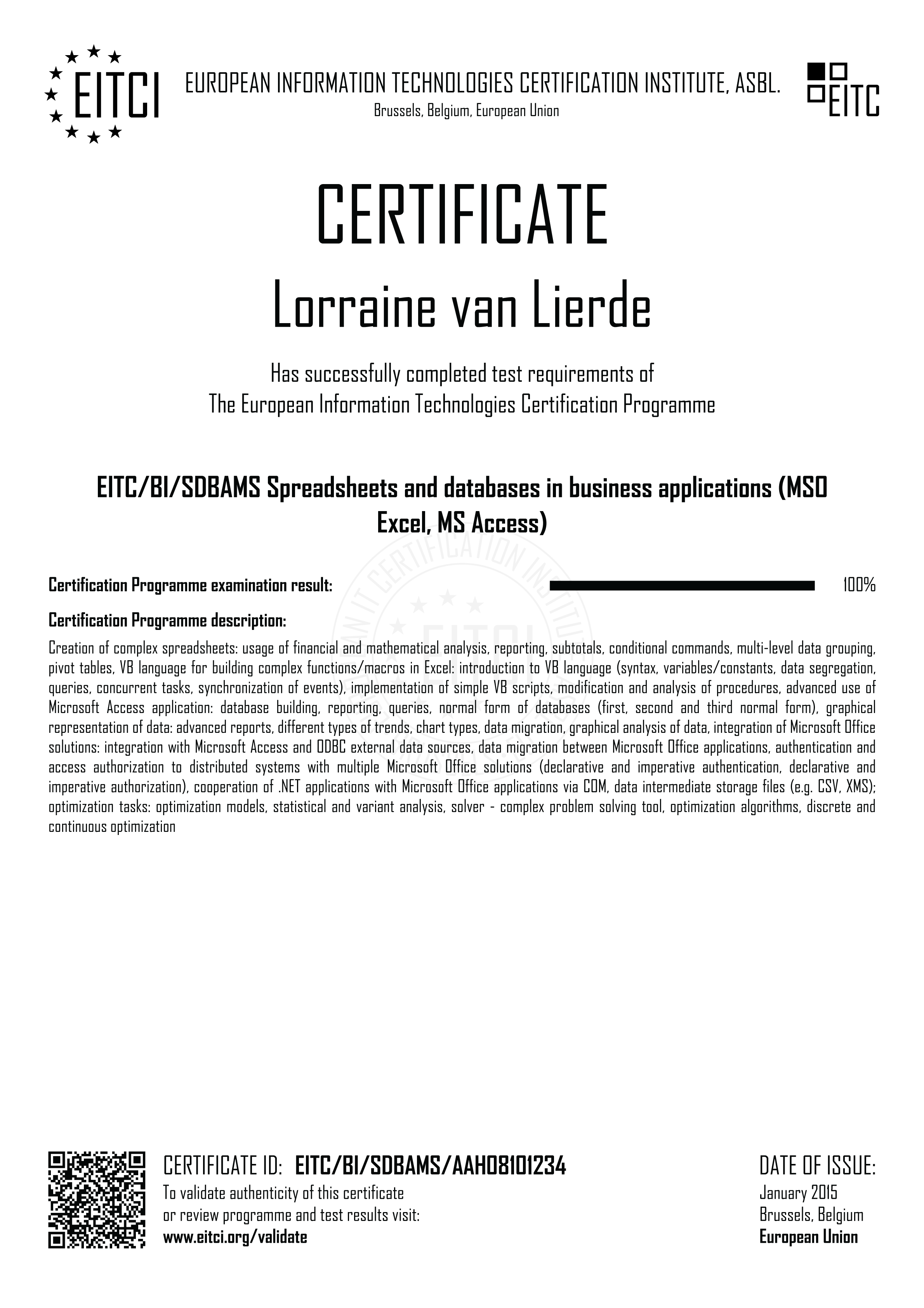 By enroling for the European Information Technologies Certification EITC/BI/SDBAMS Spreadsheets and databases in business applications (MSO Excel, MS Access) you will have access to the complete didactic programme corresponding to the Certification Curriculum and the relevant examination procedure implemented fully remotely (with free additional retakes if required). Upon successful passing of the EITC/BI/SDBAMS examination a verifiable personalized EITC Certification will be issued in your name from Brussels under governance of the European Information Technologies Certification Institute EITCI, the accreditation and certification body for the programme. For all the details on the certification procedure please refer to How It Works section.