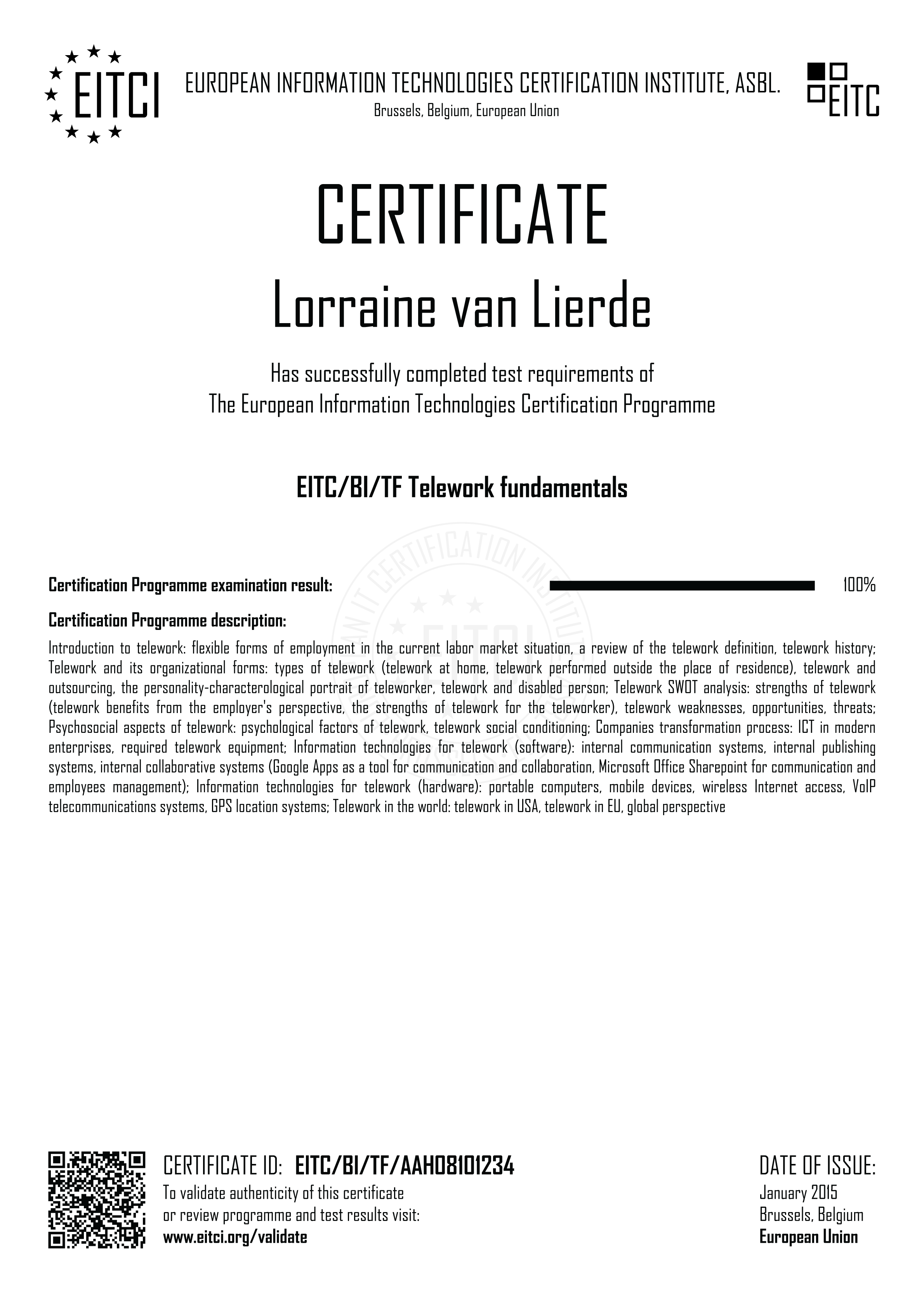 By enroling for the European Information Technologies Certification EITC/BI/TF Telework fundamentals you will have access to the complete didactic programme corresponding to the Certification Curriculum and the relevant examination procedure implemented fully remotely (with free additional retakes if required). Upon successful passing of the EITC/BI/TF examination a verifiable personalized EITC Certification will be issued in your name from Brussels under governance of the European Information Technologies Certification Institute EITCI, the accreditation and certification body for the programme. For all the details on the certification procedure please refer to How It Works section.