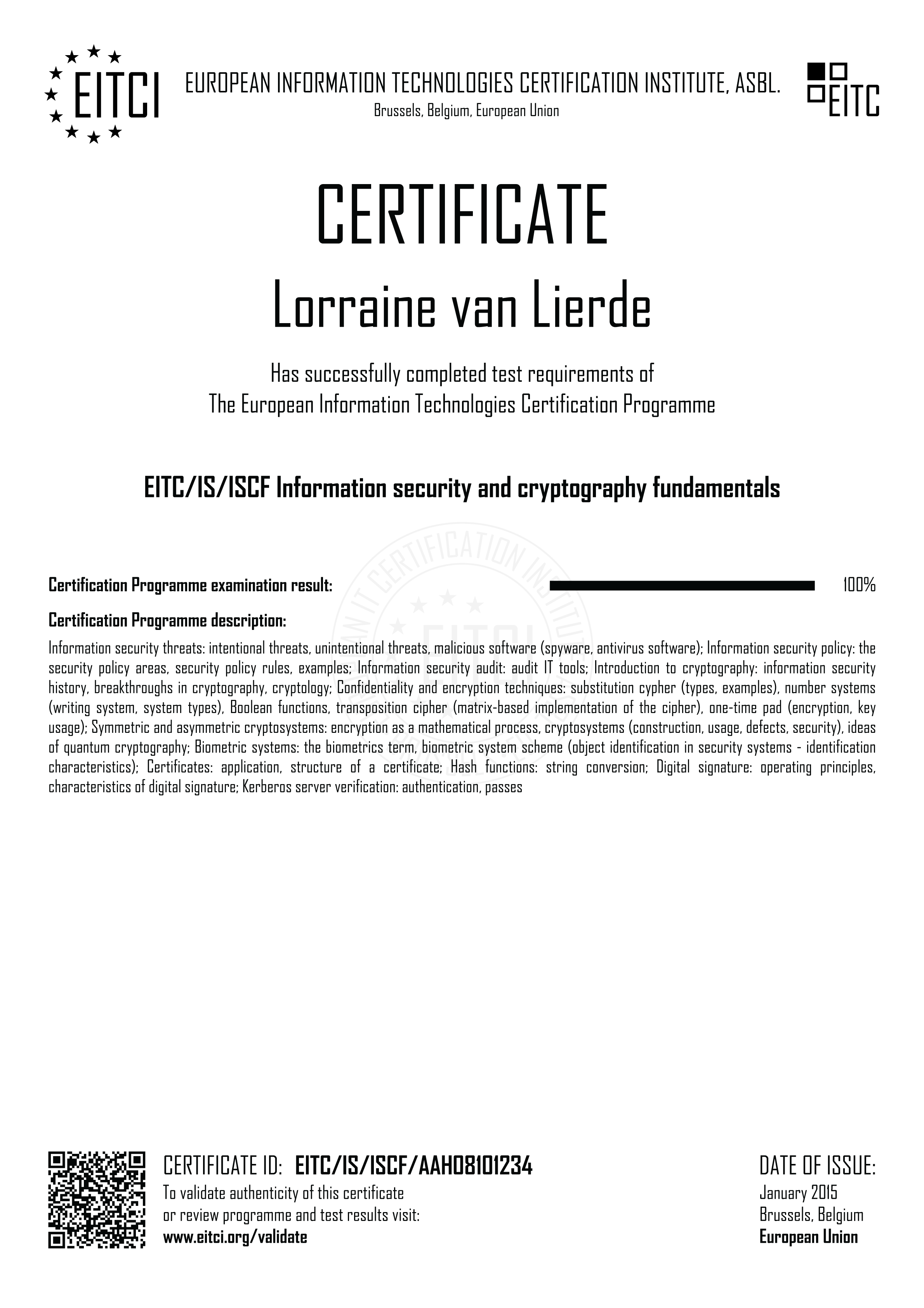 By enroling for the European Information Technologies Certification EITC/IS/ISCF Information security and cryptography fundamentals you will have access to the complete didactic programme corresponding to the Certification Curriculum and the relevant examination procedure implemented fully remotely (with free additional retakes if required). Upon successful passing of the EITC/IS/ISCF examination a verifiable personalized EITC Certification will be issued in your name from Brussels under governance of the European Information Technologies Certification Institute EITCI, the accreditation and certification body for the programme. For all the details on the certification procedure please refer to How It Works section.
