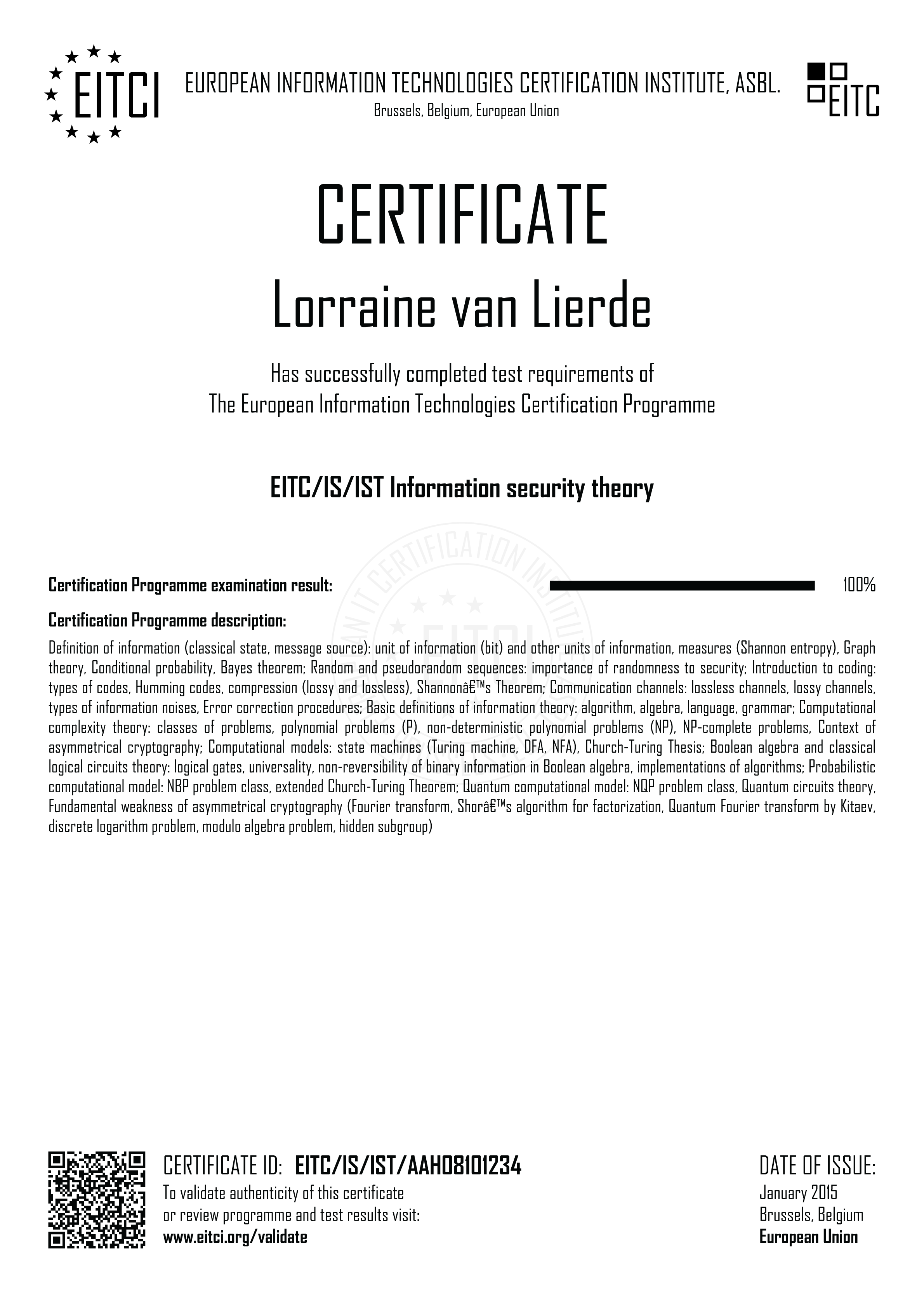By enroling for the European Information Technologies Certification EITC/IS/IST Information security theory you will have access to the complete didactic programme corresponding to the Certification Curriculum and the relevant examination procedure implemented fully remotely (with free additional retakes if required). Upon successful passing of the EITC/IS/IST examination a verifiable personalized EITC Certification will be issued in your name from Brussels under governance of the European Information Technologies Certification Institute EITCI, the accreditation and certification body for the programme. For all the details on the certification procedure please refer to How It Works section.
